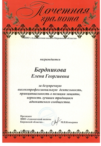 Награждена почетной грамотой Адвокатской палаты Кировской области за безупречную высокопрофессиональную деятельность, а, также, благодарственным письмом администрации муниципального образования «Город Киров» за высокий профессионализм и вклад в развитие адвокатуры.